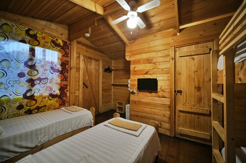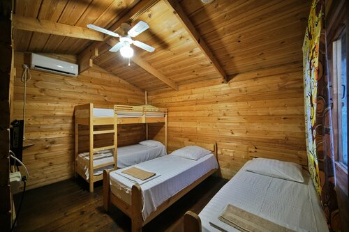 Отдыхали в конце июля 2025 года, с детьми. Как всегда перед бронированием прочитал негативные отзывы) Подводя итоги: 1) Кровати из дерева, но дерево очень хорошо обработанное, по мне так намного экологичнее чем ЛДСП; 2) Для тех кто боится пауков, купите дихлофос (современные средства практически безвредны для человека) в ближайшем магазинчике, цена вопроса 100 руб, обработайте помещение и езжайте, к примеру, любоваться озером Рицца и особенно дорогой к нему). по приезду ни одного паука не будет 3) Ни разу не видел что бы собака лаяла, в основном бегает и выпрашивает, что бы дали что то вкусненькое со стола, как и пара местных кошек) И в целом: место отличное, очень много зелени, прекрасный влажный воздух, есть кафе-бар, готовят вкусно и недорого, есть напитки и для детей, и для взрослых), море рядом! Для тех кто едет за эко-отдыхом, вам как раз сюда! Привет Артуру, Луису, Майклу!!!