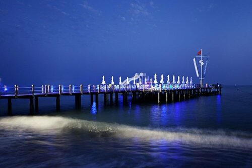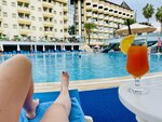 Территория хоть и не очень большая, но ухоженная и чистая. Имеются два бассейна, большой, с музыкой и развлечениями, и водными горками и «тихий» бассейн для спокойного отдыха, там же детский лягушатник. Отдельный плюс в отеле большой широкий пирс с лежаками, небольшой площадкой для прыжков с него, и двумя водными горками прямо в море. Я не люблю заходить с берега в воду, поэтому пирс для меня один из важных критериев.