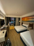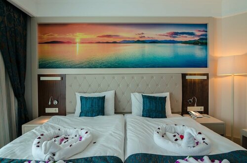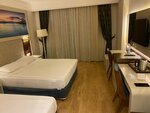 Просторный и чистый, у нас был на 2 этаже и выход на балкон был на сцену амфитеатра и аквапарк, нам вообще ничего не мешало! Большой балкон, приватный - по бокам отделен от соседних номеров, с отличным видом на горы, особенно рассветы и закаты... красота... Чистая ванная комната, все принадлежности были мыло, фен, полотенца, гель для душа, шампунь и бальзам, туалетная бумага! Качественная уборка каждый день.Одеяла в номере не оказалось – укрывались пледом, что очень непривычно.Телевизор почти не смотрели, из русских каналов было всего два,Wi-Fi в номере работает отлично. Мини-бар есть в холодильнике вода 2 бутылки обычной воды, 2 бутылки газированной, 2 банки кока-кола, 2 банки спрайта, 2 банки швепса! в номере есть чайник 2 стакана кофе , сливки ,чай разный и чёрный и зеленый , сахар, ложки и стояла отдельно не охлажденная бутылка воды 1,5 литра! Кондиционер работает хорошо, но только если закрыта балконная дверь. Когда выходишь на балкон взять или повесить вещи или покурить мы оба курящие - мгновенно выключается, это практически везде так, экономия!