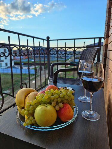 Номер : очень уютный, чистый, кружки и чайник с небольшим холодильником имеется. Имеется балкон, пепельница , верёвки для сушки вещей, прищепки) Есть швабра, что очень важно, т. к. ближайший пляж песчаный.