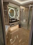 - номера - просторный номер и ванная комната. В номере есть все необходимое: тапочки, халаты, фен, банные принадлежности (гель, шампунь, кондиционер для волос, лосьон для тела). Большая кровать, несколько подушек. Стол с креслом, диванчик, шкаф, холодильник. Все управление в номере через планшет (свет, температура, заказ еды и пр.). В ванной есть и ванна и душевая. Шума никакого не слышала в номере (номер выходил в сторону бассейна). Кондиционер работает тихо, дует отлично.