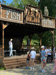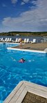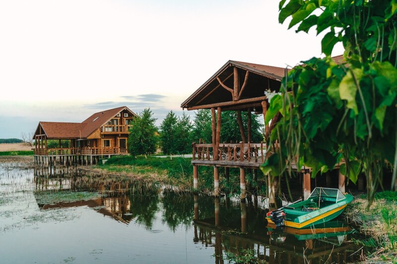 Удаленное место на берегу реки. Как я поняла, в реке купаться нельзя. Территория небольшая, чистая. Один большой бассейн, два небольших, есть раздевалка, навесы, лежаки. Рядом небольшая детская площадка. Также чуть дальше есть поле-футбол, волейбол.Есть фастфуд, бар недалеко от бассейна, ресторан ( больше похож на столовую). Брали в аренду домик на 2 человека, очень небольшой, все необходимое есть ( небольшая кухня без плиты, микроволновка, холодильник, посуда), современный санузел. Чисто, за исключением ламп, и то это видно только утром, когда просыпаешься, т.к. кровать на 2 этаже, она как навес. Рядом с кроватью прикроватный столик, телевизор и кондер. Очень компактно. Перед домиком закрытая терраса со столиком и 2 креслами. Стоимость 6 т.р. Завтрак был включен. Завтрак-особо без изысков, но но голодным не будешь. Можно взять велосипеды на прокат, они подубитые и как выяснилось, ехать особо некуда, по проселочной дороге гоняют на высокой скорости авто, поднимая столбы пыли. Мы прокатились вдоль дороги, ведущей к хутору, видели маленького лисенка. Особо гулять не где. В пешей доступности ничего нет. Отдых на 1-2 дня. В целом, ребенок доволен отдыхом, т.к. ему было достаточно бассейна) с удовольствием приезжаю сюда отдохнуть от города.