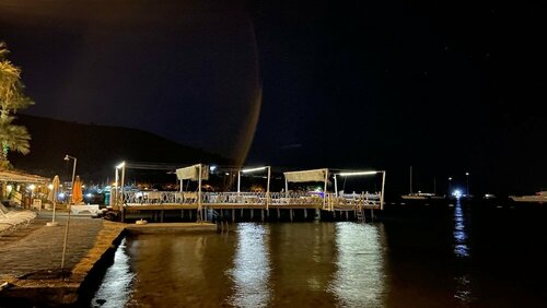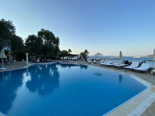 Находится в селе Торба 10 мин. на машине от Бодрума. Место тихое, спокойное, свой пляж с мелкой галькой, лежаки , навес все входит в стоимость. Номер прохладный, при 35 жары кондей не включали ни разу. Персонал не навязчивый и отзывчивый. Предупреждаю - русский язык не знают, немецкий плохо. Общение на турецком или английском. Нам с женой очень понравилось.