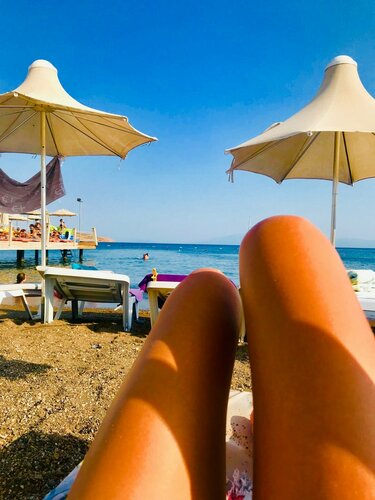 Отель расположен в центральной части пляжа Ортакент-Яхши, фактически это пригород Бодрума (на машине до Бодрумская крепости мы добирались более получаса и с пробками) довольно удачно, слева и справа подобные же небольшие семейные отели, рядом автобусная остановка, стоянка такси, улица с магазинами. Сам отель лицом выходит на променад (без машин), где вдоль прогулочной зоны находятся кафе и рестораны. У отеля свои лежаки, мы выходили на пляж с утра и удивлялись, что кроме наших было занято лишь несколько лежаков. В основном посетители этого района Турции почему-то появляются на пляже после 15 часов с плавным переходом с пляжа в ресторан на вечерний ужин. В общем, пляж оборудованный, чистый, заход удобный и для детей, и для взрослых, купаться можно по всей длине, в воде никаких ограничений нет. Единственно могу отметить, что он все же узковат и лежаки расположены близко к воде и довольно близко друг к другу, но ввиду не сильной загруженности пляжа в начале июля по утрам это не вызывало дискомфорта. Водные виды спорта не докучают, никакого запаха солярки нет.