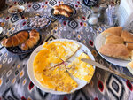 5) Сытный завтрак на крытой веранде - яичница с жареным луком, домашняя выпечка, свежий каймак, варенье (видимо, тоже домашнее), фрукты, арахис в сахаре, варёный кофе и чай - все очень вкусно.