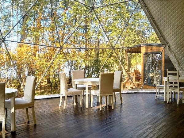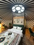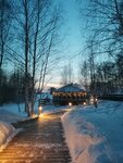 Есть мангальные зоны с беседками и лавками, трапезная с блюдами из русской печи, геосфера с панорамным видом на озеро для проведения мероприятий. Парковка для машин включена в проживание.