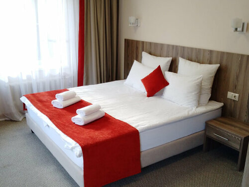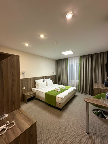 Неоднозначные впечатления оставил данный отель, но давайте обо всем по порядку. Потребовался отель для ночевки перед вылетом из аэропорта Домодедово. И данный отель по месторасположению - это отличный вариант: буквально в 5-7 минутах езды. Забронировал номер на двоих без проблем, перезвонили и подтвердили бронь, а также уточнили время заезда - за это респект. Ехали на автомобиле по навигатору - немного поплутали, т.к. навигация нестабильная, но в целом добрались нормально. Отель находится в стороне от города, дорога хорошая, но есть ж/д переезд (можно постоять в ожидании проезда электрички). Пешком до города (ближайшего магазина/кафе) далековато - учитывайте это. Добрались мы уже затемно, остановились на плохо освещенной парковке. Корпуса отеля видим, но куда идти непонятно. Поэтому пришлось звонить и уточнять где вход. Оформили нас оперативно, оплатили наличными, выдали электпонный ключ. Номер в соседнем корпусе на втором этаже с одной большой кроватью. На входе в корпус сразу отметили ощутимое тепло - это было актуально, так как на улице октябрь, идёт дождь и +4 градуса. Но по приходу в номер мы малость обалдели: номер угловой, два окна, 3 батареи И ВСЕ ХОЛОДНЫЕ, свеженько и ОБОГРЕВАТЕЛЬ в виде небольшой тепловой пушки. Да уж... Времени "меняться" не было. Нагрели номер более-менее быстро, но спать с шумной теплопушкой невозможно. Одеяла тёплые, так что не замёрзли. Сам номер просторный, фото на сайте соответствуют реальности. Есть в принципе всё необходимое. Можно было бы конечно ещё комплекты для чистки зубов положить и пару пакетиков чая+сахара, но это уже придирки. Многие пишут про проблемы с горячей водой - у нас их не было, горячая вода шла сразу и с хорошим напором.