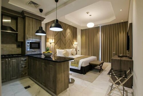Приличный отель, апартаменты - есть кухня, холодильник стиралка, бассейн на крыше, тренажёрный зал, парковка, при наличии авто недалеко общественный пляж Al Mamzer Beach, рыбный рынок Дубая, в пешей доступности Carrefour, кафешки с индийской и пакистанской кухней, на границе Дубай и Шарджа