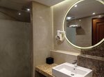 В первый день был казус с водой - ее нужно включить и уйти на 3-5 минут по своим делам - она будет нагреваться. Все смесители Grohe, но они текут! Тонкая отпочковывающаяся струйка от ручной лейки (я назвала ее "писающая лейка") и фонтан в сторону от тропического душа (он перепрыгивает через стеклянную дверцу и льется на ледяной мраморный пол, образуя оазис). То есть помыться только лейкой, так как тропик душ фактически не работает.