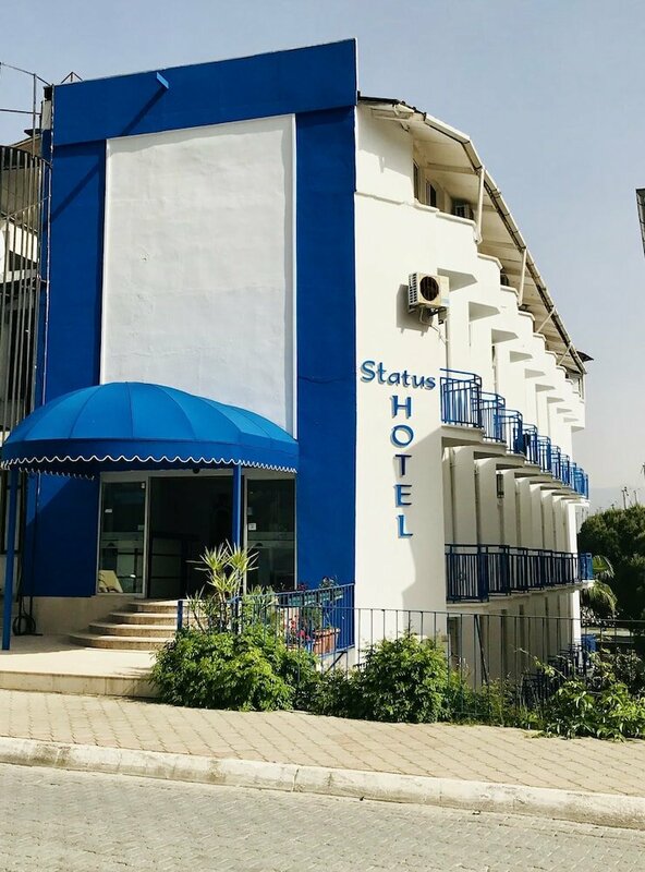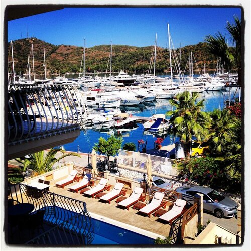 Прямо напротив входа в марину. Свой пляж, отвезут на лодке. Вид на ночной город и фетийский залив. Чистейшие номера