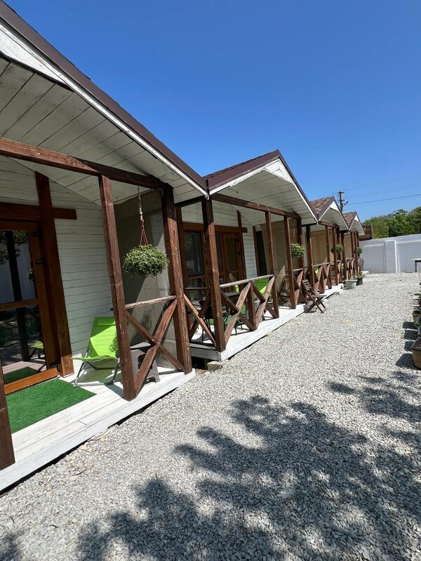 По расположению. Домики находятся в очень удобном, тихом месте. Семьям отлично. От гостевого дома можно пешком добраться на песчаный пляж (он немного подальше (10-15 мин) и путь лежит через две вонючие помойки) и на галечные (5-7 мин). Галечных пляжа два: оборудованный и полудикий для любителей сабов. Есть еще хорошие пляжи, туда мы ездили на машине, потому что ленивые. Заходы в море везде разные, лучше использовать обувь типа резиновых каралок. Море чистое, теплое. Отмечу, что за все время пребывания нам посчастливилось не встретить ни одного пятнышка мазута. За 20-25 минут можно доехать до центра города (машина/taxi) и погулять по людному месту на набережной.