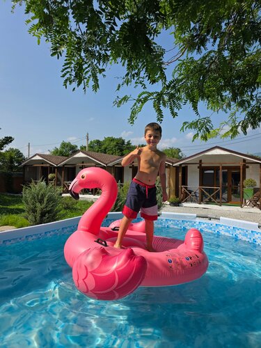 По территории. Неплохое пространство, есть где провести время детям, стоит приятный каркасный бассейн. За водой хозяйка всегда следит, проблем нет. Есть два ржавых мангала и 2 ужасно зашкваренные решетки (если каждый бы их за собой мыл, то проблема частично нивилировалась, но увы). Напротив домиков определяется замороженная стройка. Общая кухня, как общая кухня, норм. Большого холодильника нет.