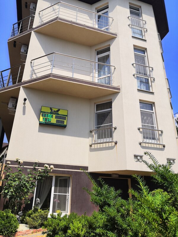 Гостевой дом «Золотой орёл» предлагает номера для 2–4 человек. В номерах есть кровати, шкафы, телевизоры, кондиционеры, холодильники, сейфы и ванные комнаты с душем. Предоставляются халаты, полотенца, тапочки. Есть большая кухня с бытовой техникой и посудой. Во дворе — зоны отдыха с качелями, мангальная площадка, детская площадка с домиком и игрушками. На территории есть прачечная со стиральной машиной и гладильной доской, парковка для автомобилей. Территория находится под круглосуточным видеонаблюдением. В стоимость проживания входят вода (горячая и холодная), смена белья и полотенец, уборка по графику. Пляж находится в 10–15 минутах ходьбы. Рядом — магазины, аптеки, столовые, почта, остановка общественного транспорта. Туристы могут заняться дайвингом, SUP-сёрфингом, морской рыбалкой, отправиться на прогулку на яхте или полетать на парашюте. В городе есть историко-краеведческий музей, музей восковых фигур, океанариум, парк развлечений «Олимп» с концертным залом и канатной дорогой.