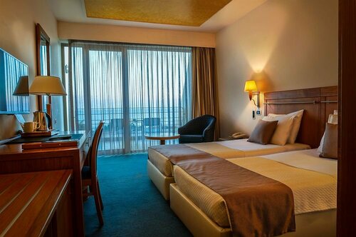 В гостинице есть ресторан, бар, тренажёрный зал, сауна, конференц-зал. Можно прогуляться по территории и в саду. И вы наверняка захотите отдохнуть у бассейна — он тут тоже есть. Причём крытый, открытый, сезонный. Море тут близко — до него всего 165 м, поэтому легко можно планировать пляжный отдых. Есть возможность взять напрокат машину, велосипед.