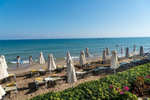 Частный пляж, пляжные полотенца и зонтики