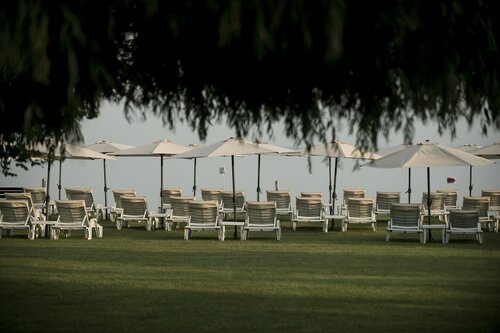 Частный пляж, пляжные полотенца и зонтики