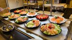 Рыба … красная рыба на завтрак в виде канапе, а так же слабосоленный лосось по утрам(не всегда, но факт). Креветки, кальмары, мидии . Так же стейки из красной рыбы - сделаны в идеале! Изобилие еды , я не знаю, как можно сказать, что питание однообразное.