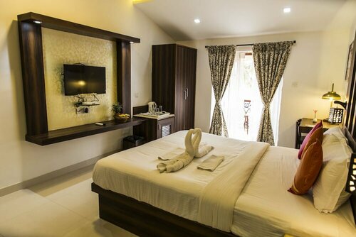 Хорошая территория, зелень, бассейны. До океана пешком минут 7. В корпусе в номерах не была, но видела, что все номера на 2 этаже с балконами, а на 1 этаже с небольшой террасой. Мы арендовали виллу нс семью. Виллы не новые, мебель и кровати уже пожили, но жить можно. Есть кухня, холодильник, стиральная машина. В ванной на 1 этаже у нас ползали муравьи. Обязательно берите с собой фумигаторы. Рядом река, мошки и комары вечером. Уборка каждый день. Завтраки скромные, готовили яйца, геркулес каждый день и несколько индийских блюд. Не плохо.