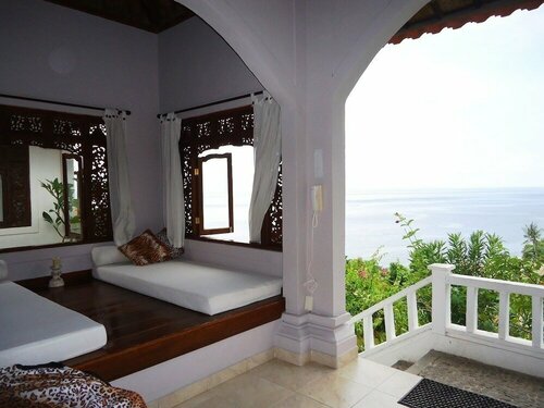 Отель расположен не очень удачно в плане инфраструктуры, магазины далеко. Кафе есть несколько, можно дойти пешком. Цены в ресторане отеля приемлемые. Завтрак включен, но там небольшой выбор блюд, надоедает. Неплохой бассейн. С маленькими детьми будет не очень удобно, отель на склоне, много ступеней. Персонал внимательный, приветливый, обслуживание хорошее. Вид из окна потрясающий, видно море и горы, полный релакс. Из деревни иногда доносится музыка или запах навоза. Прямо у отеля пляжа нет, крупная галька, зато есть затонувшее японское судно времен 2 мировой войны. Там же и кораллы неплохие. Снорклинг, дайвинг. В бухте рядом берег песчаный, мелко, тоже кораллы, народу нет совсем