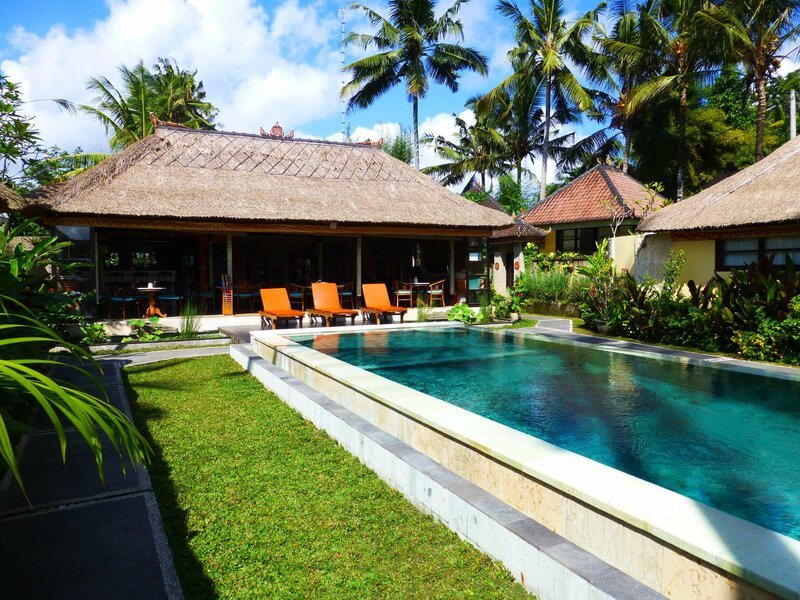 Этот живописный, уютный отель был нашей первой остановкой на Бали. Именно о таком отеле я и мечтала. Каждая вилла имеет свой маленький, внутренний дворик, пруд с рыбками, гамак. Внутри виллы все аутентично. Большая, удобная кровать с балдахином, деревянный комод, диван, набор игр, кондиционер, все очень красиво. Душ и туалет находится под открытым небом,на стенах растут разные виды орхидей. На собственной террасе можно попить чай, имеется чайник, кружки. Уборку делают каждый день. За 5 дней проживания в номер не попала ни одна живность, хоть я и боялась, но каждую ночь мы спала под песни лягушки. В этом отеле находишься, как в дикой природе, соответственно и ее звуки тебя постоянно окружают. Да, отель не новый, но все чисто, в номере имеются большой набор настольных игр. В этом месте хочется забыться и никуда не спешить. Не большой бассейн, но чистый. Вилл расположено немного, поэтому и людей немного. Завтраки однообразные, но вкусные. Я люблю омлет и мне не надоело его есть каждый день, также свежие выпеченный круассан, овощи, свежевыжатый сок, кофе или чай. Сложно остаться голодным. Весь персонал дружелюбный, разговаривает на английском. Утром сидя за завтраком наблюдаешь за работой людей на рисовых плантациях, вечером наблюдаешь за прекрасным закатом. Сам отель находится, вроде бы, в уединении от дороги, но в то же время недалеко от магазинчиков, кафе, леса обезьян, проката мопедов. Это был потрясающий уютный, гостевой отель. Я бы с удовольствием вернулась в него