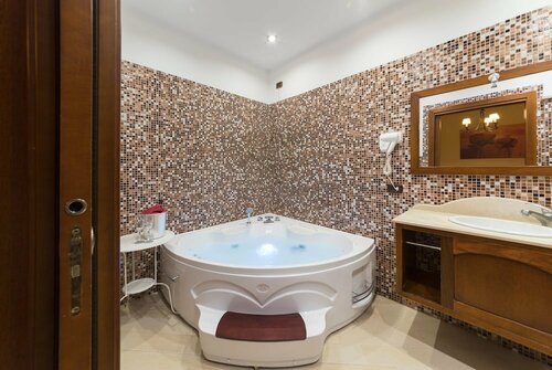 Здесь созданы все условия для комфортного проживания — есть кондиционер, телевизор, фен, сейф, отопление, мини-бар. Уборка — по запросу.