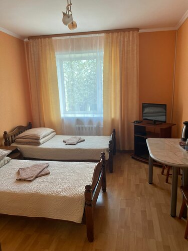 В комнате есть всё необходимое: стол, стулья, посуда, телевизор, холодильник и чайник. Кровати обеспечивают комфортный сон.