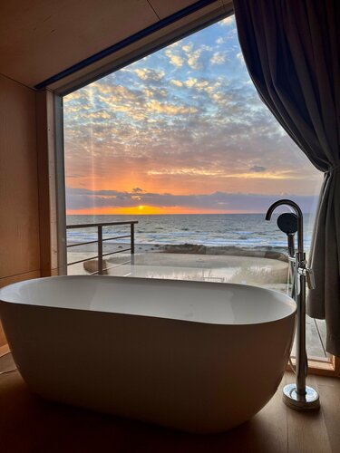 В ванной комнате установлена ванна - можно поплавать, подстилка против скольжения - всё продумано. Шампунь, мыло, бокалы, туалетная бумага, чистые белоснежные полотенца. Электрический чайник, чай, сахар, стаканы и кружки с блюдечками и ложечками. Имеется телевизор, но, сомневаюсь, что кто-то смотрит эту ерунду. На каждом этаже есть кулер с водой.