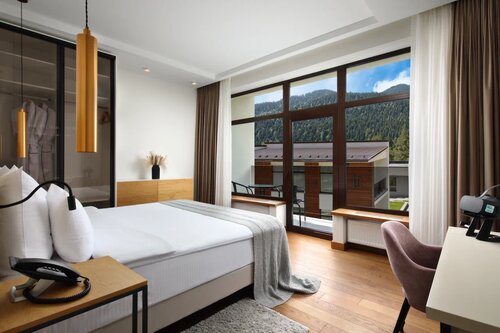 Отличный номер, есть все что нужно и что может понадобиться (от швейных принадлежностей до сейфа). Много шкафов для размещения вещей. Шикарный вид из окна на горные вершины. Неплохая территория с детской площадкой и красивой подсветкой. В целом достаточно тихо.