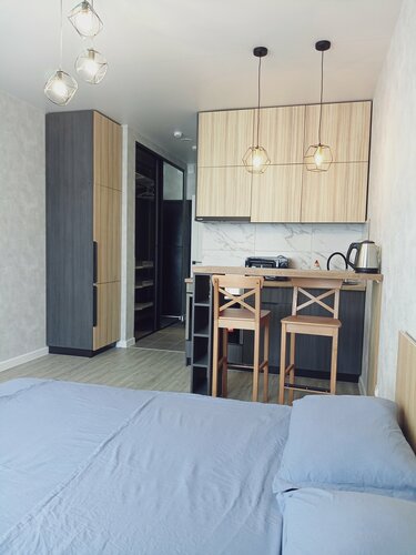 Отсутствие кондиционера, если честно, испортило всё впечатление. Студия с окнами на запад, где солнце всю вторую половину дня и без кондиционера - это беда. Зеркало в ванне показывало температуру +35. Окно открывается только в режим проветривания. В остальном свежий ремонт, фен есть. Хотелось бы ещё, чтоб кроме соли на кухне оставляли для гостей хотя бы чай, сахар и салфетки.