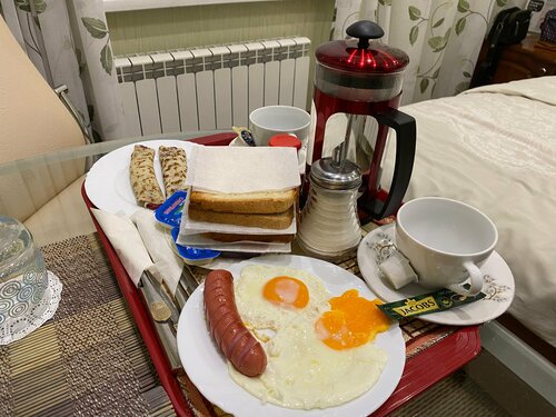 Встретила добродушная администратор, все рассказала. Завтрак можно заказать, 350р. с человека (два тоста, джем, масло, глазунья и две сосиски, чай или кофе. Если зерновой из кофемашины, то дополнительно 150 р.
