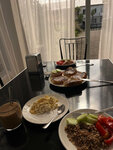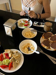 Завтраки нормальные- всегда чай,кофе, мед, джем, шоколадная паста, творог, мясная нарезка (вкусная и съедобная), масло, вареные яйца, жареные сосиски. И менялись- либо овсяная каша, либо гречка, либо рис с овощами (типа плова), либо пельмени, либо пюре, блины....Короче говоря- вкусно и съедобно.... Завтрак с 9 до 11-00.