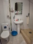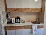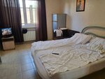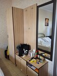 В номере есть кухонный гарнитур, чайник, микроволновка, мультиварка, холодильник, немного посуды к этому, странная история с учётом, что за спиной у вас кровать - но возможно кому то это нужно. Маленький телевизор, старое кресло, тумбочка - странный потрёпанный набор мебели в одном помещении. Санузел в номере, душ там же, вытяжка не работает, на вас без конца падает палка с ширмой, но есть индивидуальный набор для душа, а так же тапочки. Туалетную бумагу добавляют каждый день, мусор выносят, уборки не заметили, а может и не входит она.