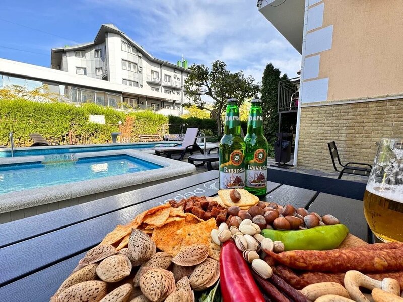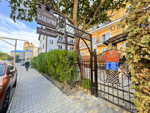 Отель вполне себе хороший. Понятно, что не 5 звезд, но для нашего юга нормально. До моря не спеша за 10 минут можно дойти, дорога идет мимо палаток с товаром, мимо овощной и фруктовой лавки, мимо шашлычек разных, идти не скучно. Многие считают, что идти далеко, но это не так. Все таки Витязево - поселок растянутый от моря, и Бавария расположена вполне себе неплохо. Рядом Паралия, тоже минут 5-10 ходьбы. При этом ночной и громкой Паралии не слышно, что удобно. Есть своя столовая, свой бассейн. Да, территория отеля небольшая. Но это и не Турция с гигантскими площадями отелей. Место действительно хорошее. Единственный минус - негде толком парковать машину. Своей парковки нет, все очень тесно. Но так во всех рядом расположенных отелях.