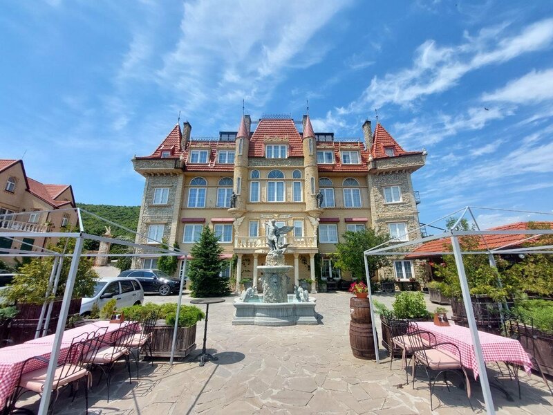 Отель «Крылья» расположен в живописной долине озера Абрау, в окружении реликтовых можжевеловых лесов. Постояльцы могут любоваться горными пейзажами из окон и кафе отеля.