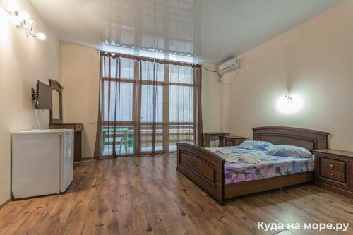 Отель понравился, открытая парковка рядом за доп. плату. Номер в отеле хороший, такой как на фото был, чистый, всё необходимое есть: кондиционер, телевизор, холодильник, шкаф, тумбочки, зеркало на стене, душ и туалет совместно, панорамные окна, вид на горы, на балконе стол и стулья, сушилка. Всё в принципе устроило, только вот матрас на кровати был не очень, продавлен. Кухня на 1 этаже, можно готовить, а на каждом этаже есть чайник и утюг с гладильной доской. За 6 суток отдали 33 т. + парковка. Море в 10 минутах от отеля. Выходишь с отеля и попадаешь на центральную улицу Дивноморска, а там есть всё: и магнит круглосуточный, аптека, разные магазины, остановка автобуса, кафешки, столовые. Рекомендую отель👍
