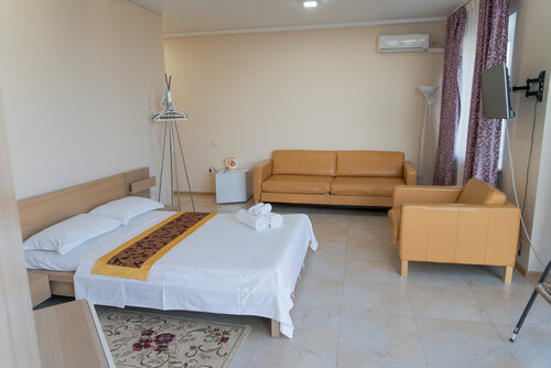 Созвонился, после разговора с хозяином забронировал номер через ватсап, там же была чётко обговорена цена, внёс предоплату за сутки и предупредил что приедем ближе к вечеру. А дальше самое интересное! Предупредил ещё раз в день приезда что приедем ближе к 5 вечера, по приезду посмотрели номер, находился на 4 этаже с виду вроде норм на 4 потянет, спустился за чемоданами, соседний номер люкс был открыт дверь настежь, заглянули посмотреть, мельком глянули и уже почти зашли в свой номер как вдруг с верхнего этажа идёт хозяин со словами (дословно) ЧТО ВЫ ТУТ БЕГАЕТЕ?? ЗАСЕЛИЛИСЬ?? Я даже растерялся... неожиданная встреча гостей, после чего он сказал что мы не доплатили! обвинив ещё и меня!!! хотя в переписке я указал даты а он ответил написав конкретную сумму. Ок! доплатили! но кто же знал что это только начало.... Походив по номеру явно не с доброжелательным видом (хотя он и старался но у него не получается) он закрыл окно, со словами что мы всю улицу не охладим, повторюсь, мы 2 минуты назад зашли в номер и только что и успели включить кондей который весь желтый от старости и явно требует либо чистки либо замены. После чего он сам заметил что у нас нет наволочек и полотенец, сходил в соседний номер принес другие подушки и полотенца, ушёл... Я с дороги пошел в душ взял полотенце а они сырые и с явным запахом, скорее всего просто грязные! ОКЕЙЙЙ мы схавали даже это!!! Смеситель в душе наполовину вода через душ наполовину через кран, из-за чего давление такое себе, и запах плесени в душевой в которой глухое окно и не открывается. Ну и ладно!! подумали мы. И вот я подошел к тому окну которое закрыл сам ХОЗЯИН, а оно тупо не закрывается полностью и снизу щель. Думаю ну нет слишком много всего, позвоню спрошу есть ли другой номер? Позвонил сказал что не так, на что услышал явное хамство (дословно) ЯСНО!! ВАМ НОМЕР НУЖЕН А НЕ МОРЕ!!! и бросил трубку! я перезвонил и попросил зайти к нам в номер, после таких разговоров оставаться там не было никакого желания! Он пришёл начал хамить и оскорблять, ходил по номеру туда сюда со словами: ЧТО ЕЩЁ ВАМ НЕ ТАК?? ЧЕГО ЕЩЁ ПРИДУМАЕТЕ?? Хотя уже решили не спорить и сделать возврат он не успокаивался и продолжал односторонний конфликт, спустившись вниз начал откровенно оскорблять, КЛОУНЫ называл он нас гостей которые приехали отдыхать и заплатили деньги! Откровенно вызывал на бОльший конфликт и разборки, явно показывая на то что он на своей территории и он здесь царь и Бог. Ничего подобного мы не видели нигде, откровенное хамство, оскорбление, неуважение, такое чувство что одолжение нам сделал предложив свои услуги. Ещё удержал 1000 рублей за то что я сходил в душ и бросил грязное вонючее полотенце на пол, ЧТО МНЕ ТЕПЕРЬ С НИМ ДЕЛАТЬ?? кричал он на весь отель... Это жесть товарищи, не верьте фото и отзывам, здание уставшее панорамные окна качаются вместе с рамой, это как минимум не безопасно!