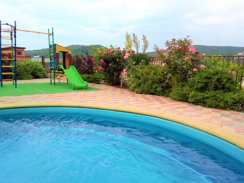 Рядом — галечный пляж с лежаками и водными аттракционами, до него можно дойти за 10–12 минут. По графику осуществляется бесплатная доставка микроавтобусом на Кипарисовое озеро и Большой Утриш.