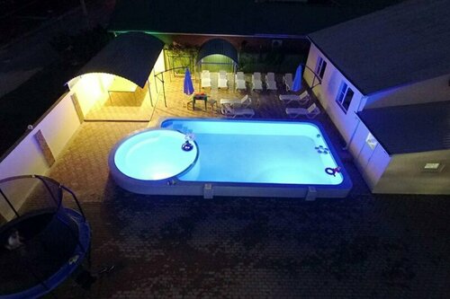 Расположение гостевого дома удачное, самый центр, море рядом. Но, в номере вместо кроватей стояли старые диваны, продавленные, неровные, спать на них очень неудобно, приехала с больной спиной, за 12 дней никто не убирался ни в номере, ни в беседках, к бассейну взрослому человеку не подойти, всё занимают дети, мало того, в бассейне ещё и собака купалась. Приготовить себе покушать нельзя, только заказное питание, но не для всех это удобно. Вот такие недостатки в этом гостевом дому. Второй раз сюда больше не приедем. Конкуренция большая, есть выбор.