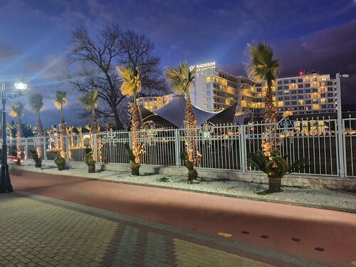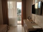 Отдыхали в этом отеле в октябре- номер большой, в современном стиле, всё функционально, удобно, чисто, балкон довольно большой- 2 кресла, столик, сушка для белья. Расположение отеля вообще замечательное- напротив Магнит, рядом в избытке кафе, столовых, ларьков с сырами, чаями, вкусняшками, автобусная остановка, а до моря 10 минут только если вы идете ооочень медленно. Рекомендую