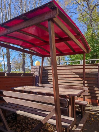 В холле стоят два прозрачных холодильника. В них вода/кола 1,5 литра по 150 рублей и лапша «Биг Ланч) по 250 рублей. Есть закрытый дворик с местом для курения.