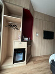 Номера небольшие, но продуманные, для городского отеля есть и плюсы и минусы. Из минусов - странное полупрозрачное полотно стены в санузле, если ночью включается свет, озаряется вся комната. В номере чисто, белье белоснежное. Мини холодильник, гладильная доска, утюг. Чайный набор.