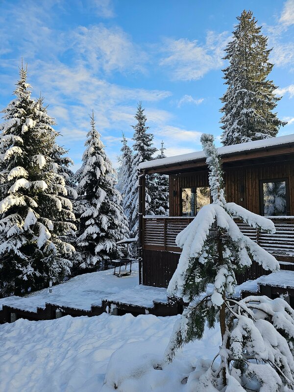Порадовало, что отзывы про пахучую воду не оправдались - отличная вода течет из крана. Тихо, воздух хороший. Поддержка домиков отвечает быстро. Дом довольно новенький и чистый, посудомойка не пахнет, вода в душе при большом напоре уходит не очень, но терпимо. Симпатичный вид на овражек и сосны. В доме есть все, кроме халатов, включая соль, сахар и растительное масло, но и магазины в 10 минутах.