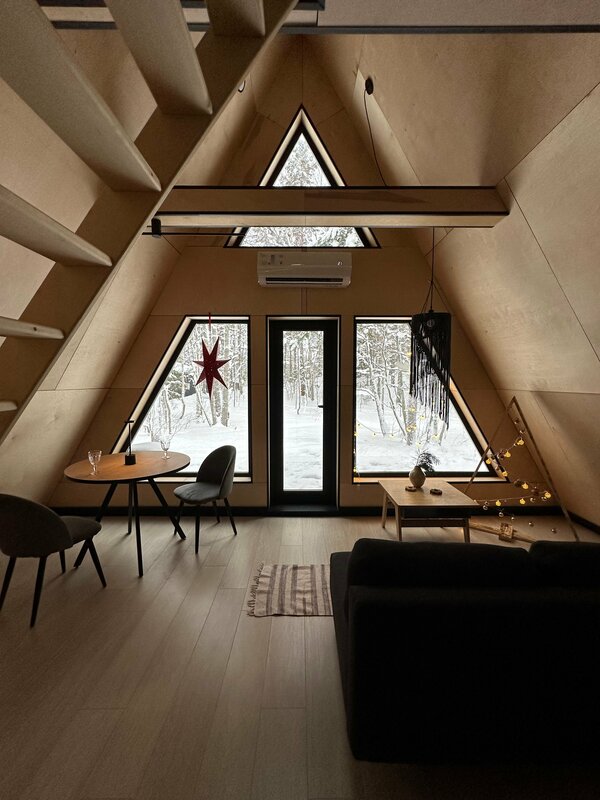 Жили двое суток в А-фрейме, находились там в большие зимние морозы. Домик отапливался с помощью кондиционера, в ванной комнате есть теплые полы. Было тепло, нигде не поддувало, но пол все же был холодным, только в тапочках.