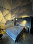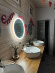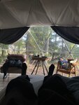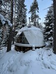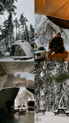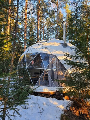 Заселялись когда стемнело, на территории гирлянды, фонарики - красиво. А утром проснулись и накрыло волной эндорфинов - заснеженный лес, замёрзший водоем, мороз, солнце, на снегу следы диких животных. Это было самое яркое впечатление!