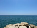 Спуск в море с лесенки , глубина по колено. Дно камни крупные. Заходили в море спиной, это легче. Слева (если стоять лицом к морю) метров в 30 есть заход там песок. Море супер!