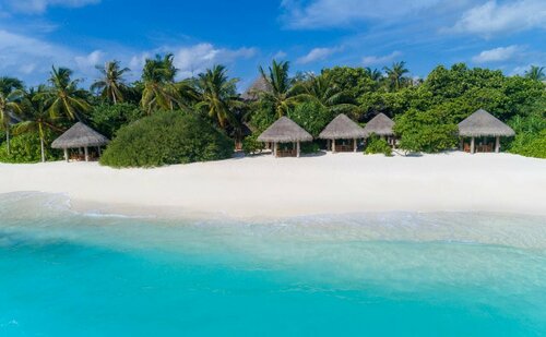 В отеле всего 50 вилл, из них 30 водных, 20 наземных. Остров маленький, тихий, очень зеленый. Обойти его по берегу заняло всего 15 минут, в длину он 300м, в ширину 180 метров.