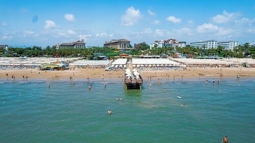 Дорога на пляж через бассейн быстрым шагом 3 мин. Есть машинка на 5 посадочных мест. Работает с 8 30 до 12 и с 12 30 до 18. На пляже с 11 до 12 30 и с 15 до 16 гезлеме сыр, мясо, картошка, зелень. На пляже 4 душа, 3 кабинки для переодевания, туалет, бар, ресторан работает как гезлеме. Вход в море очень плавный, мелко метров на 50. Песок убирают, бывает много водорослей в воде но не каждый день, пару дней большие волны. Водоросли с берега убирают каждый день.
