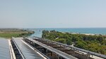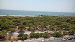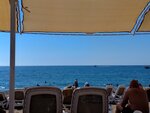 До пляжа неспешным шагом с ребёнком идти около десяти минут. В жару ездили на маршрутке, которая ходит по расписанию. Пляж заявлен как песчаный, но на самом деле песок находится только в зоне тентов. У береговой линии ≈20 метров это очень мелкая галька. Не очень понравился заход в море. Несколько шагов и дна уже не достать. Для детей, не умеющих плавать это существенная проблема. Сразу вспомнился любимый Закинф и Лаганас, где малышам просто кайфово и нестрашно. По ходу движения к пляжу, слева есть сосновый парк, оборудованный специальными зонами для приготовления шашлыка местными жителями. Если ваши окна будут выходить на шоссейную трассу и на этот парк, будьте готовы к тому, что по выходным дням капризная Роза ветров будет приносить в ваш номер не запах морского бриза, а запах костра и жареного мяса с соответствующей музыкой.
