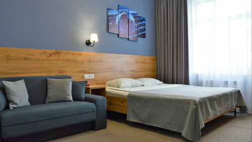 Выбрали для проживания категорию бизнес. Номер расположен в одноэтажном домике рядом, выглядит красиво, все новое, места достаточно. В холле есть кулер с водой. Матрас хороший, жесткий, есть дополнительное одеяло, постельное белье чистое, хорошего качества, шторы плотные. Все вместе это обеспечивает хороший сон. В номере есть холодильник, микроволновка, мойка, немного посуды. Шкаф большой, вместительный, есть стол, много дополнительного освещения. В ванной вся сантехника чистая, в хорошем состоянии. Напор воды и ее температура просто отличные! Есть и обычный душ и верхний, наподобие тропического. Есть и некоторые замечания: конкретно в нашем номере в ванной мало места для размещения принадлежностей и одежды: одежду можно повесить только на полотенцесушитель, но это не очень удобно. Крючков нет. Нет также полочки, на которую можно поставить шампунь, гель и т.д., поэтому все приходится раскладывать на бортиках ванны. С учетом того, что с собой брали дорожный набор, в котором флаконы маленькие, все поместилось. На человека предоставили 3 полотенца (для ног, для рук, банное) полотенца нормальные, чистые, однако, ощущается, что они пережили много стирок. Одноразовые щетки, зубную пасту, гель, шампунь выдали. На мой взгляд, в номерах сильная слышимость: буквально вздрагиваешь, когда открывают соседнюю дверь, также очень слышно разговоры людей в коридоре. Не помешала бы табличка с просьбой не шуметь в ночное время. А вот с улицы шума никакого не было, район спокойный. Не надейтесь здесь увидеть потрясающие виды, набережную отсюда не видно, да и весь остальной город примерно так же выглядит, зато тихо и это большой плюс. Завтраки проходят в кафе рядом, но оно отдельно стоит. Завтрак по карточкам, которые нужно брать каждый раз новые на следующий день, а в кафе их забирают. Завтрак вкусный, нам всего хватило. Примерные блюда: рыбные палочки, нагетсы, нарезка колбасы, сыра, сосиски, омлет, творожная запеканка, картофель, отварные овощи, каша на молоке, творог, кажется, еще есть гарниры, сгущенка, соусы. Есть кофемашина, варит эспрессо, рядом молоко есть. Можно взять чайный пакетик, шарики несквик. Из сладкого: вафли, печенье 2 видов, кекс зебра, нарезанные яблоки, апельсины.