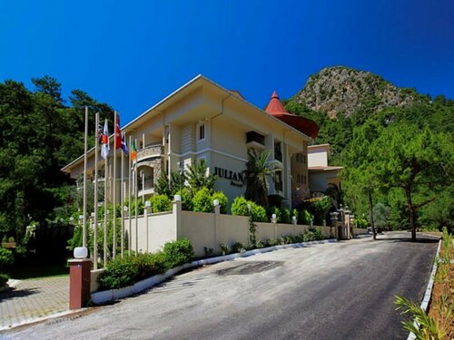 Отель находится на самой окраине Ичмелера, тихо,красиво...Далеко от моря, но при желании туда можно доехать на маршрутке, конечная остановка находиться прямо возле отеля.А кроме этого,каждый день с утра,ходит бесплатный микроавтобус на пляж (но там за то что лежишь-чего то покупать в баре пляжа нужно).